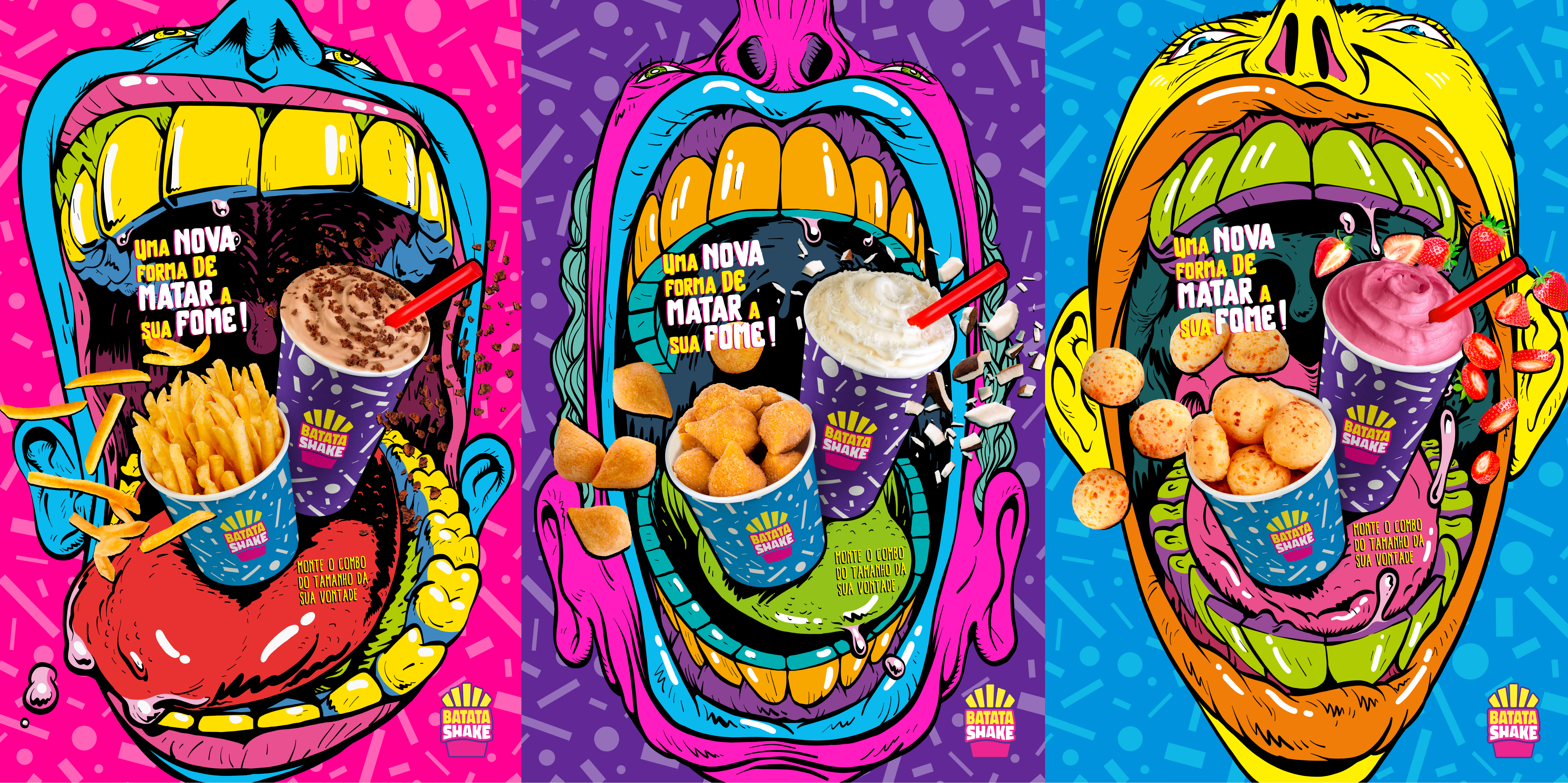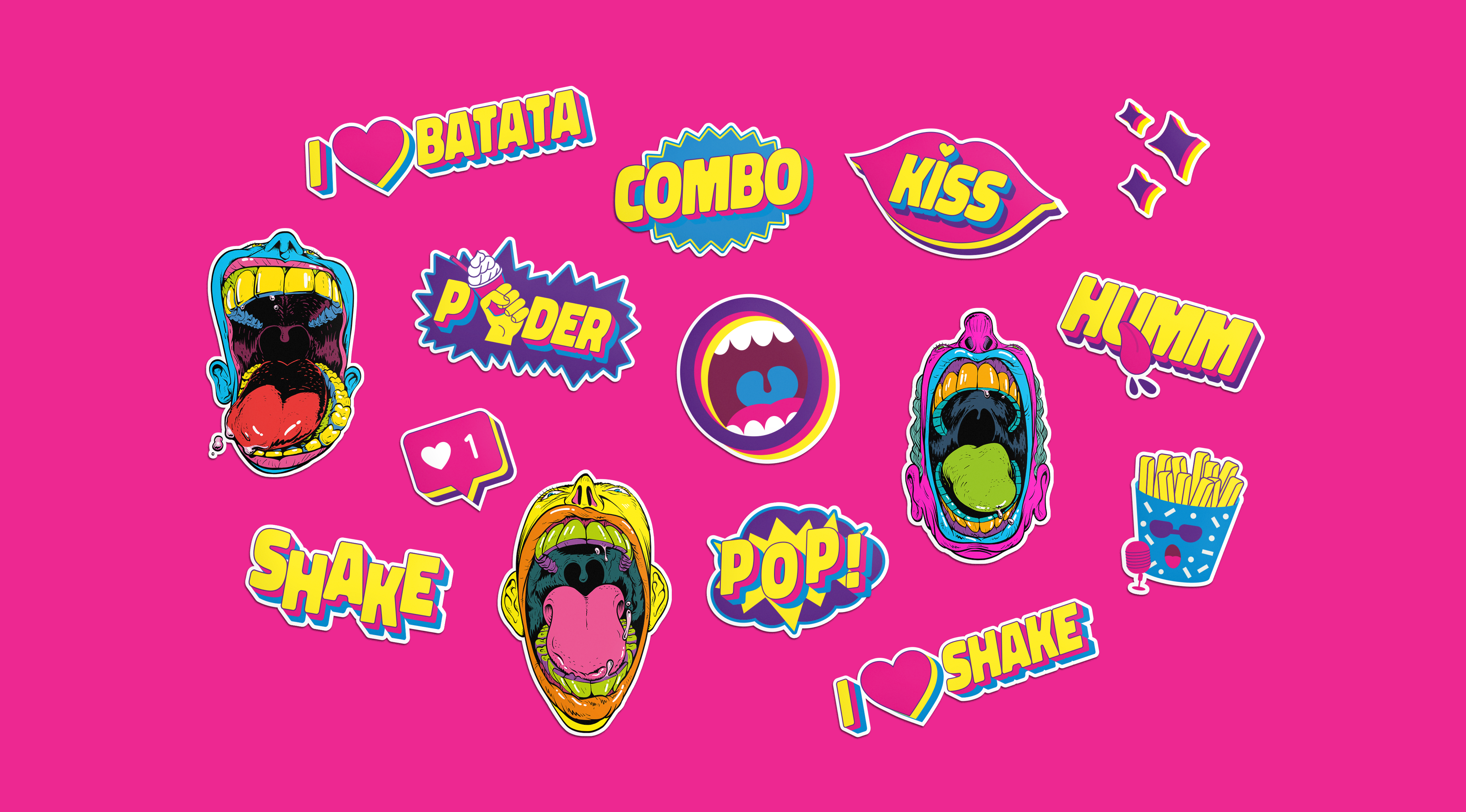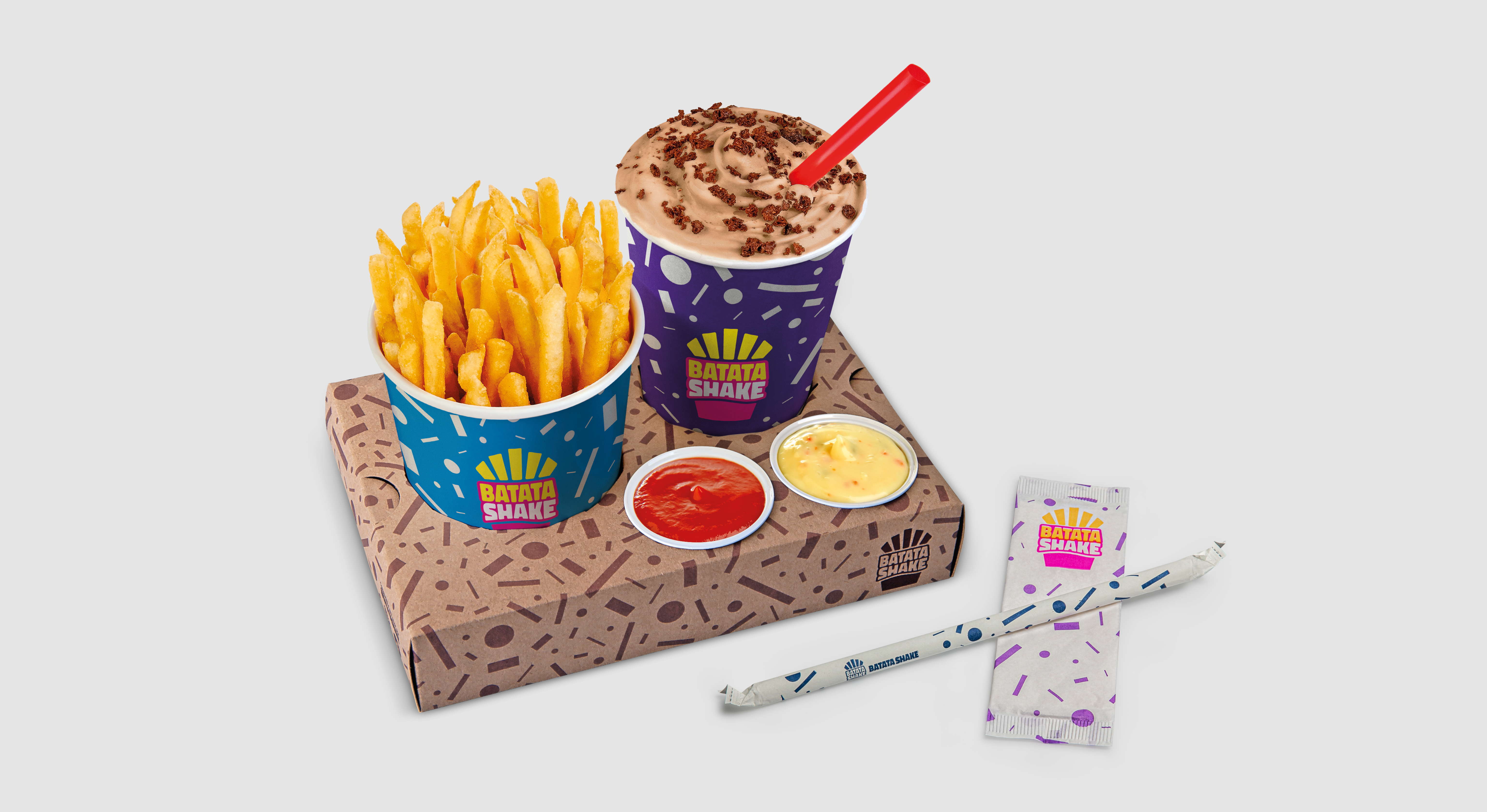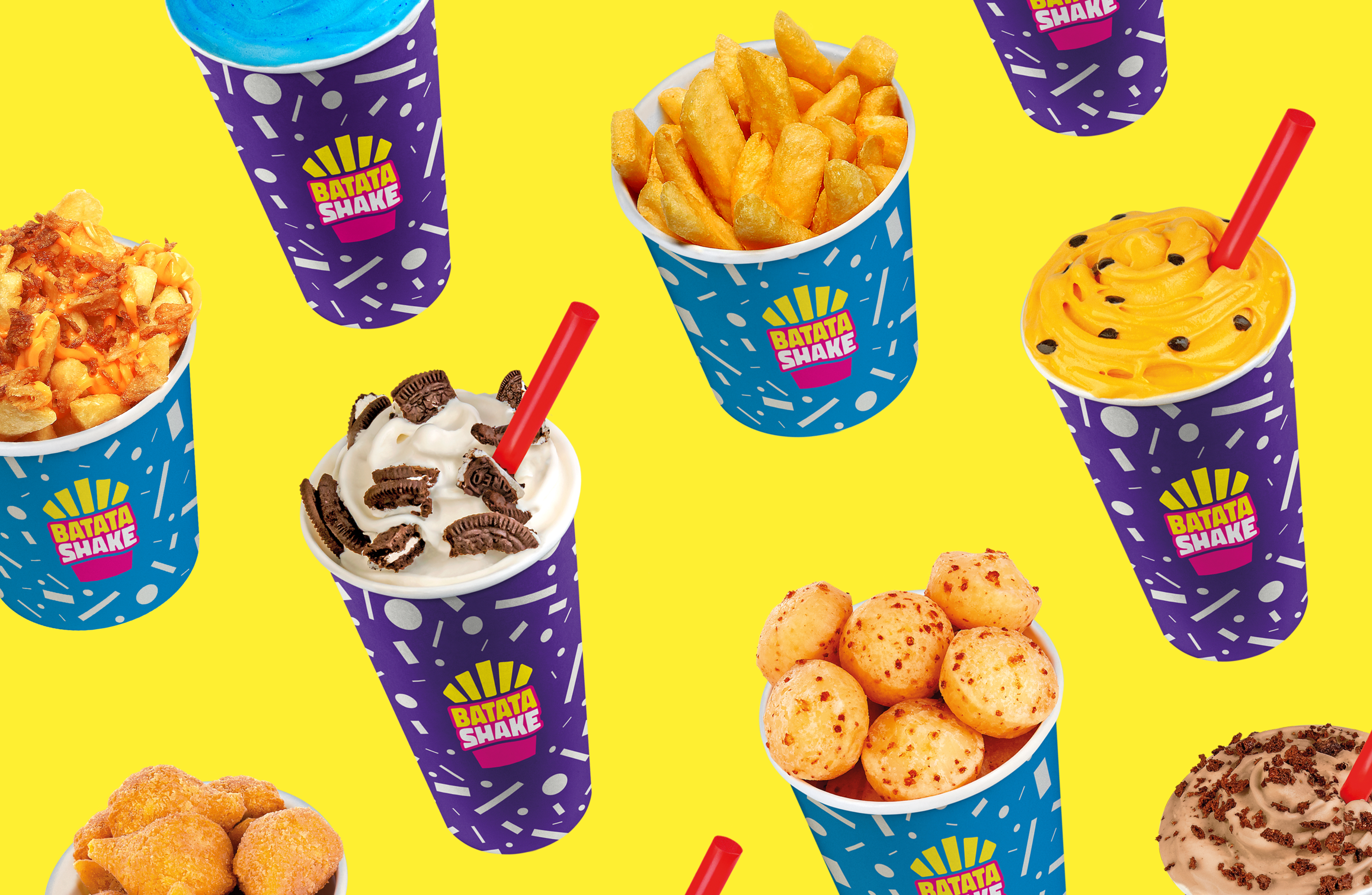 The strategy to solve the challenge involved reinterpreting the classic aesthetics of the 80s in a vibrant and renewed way for the Batata Shake brand. Vibrant colors and a pattern of random geometric shapes were chosen, referencing products such as French fries and chocolate sprinkles in a playful manner. This pattern is present throughout the brand's identity, conveying a youthful, inviting, and diverse atmosphere.