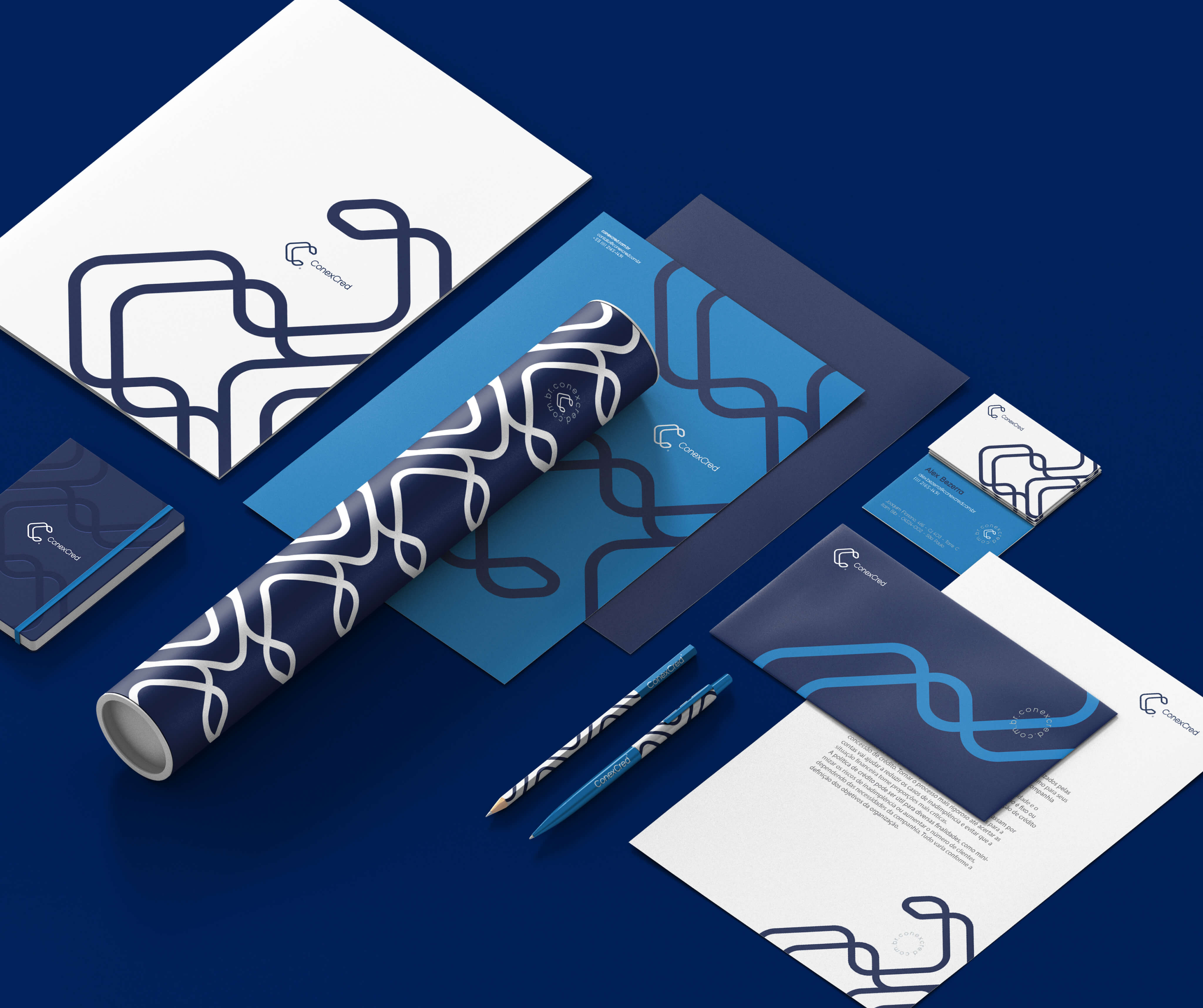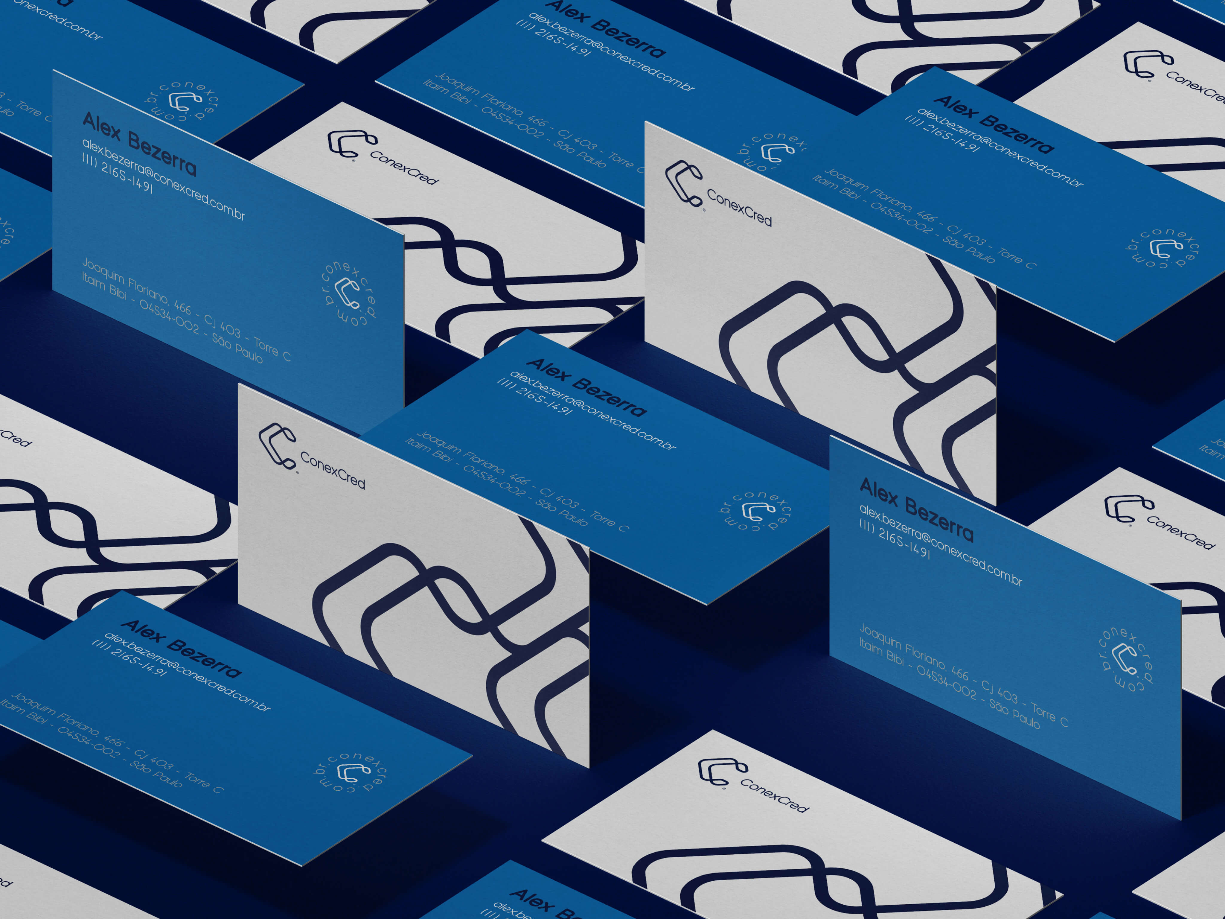 We start from the idea of connection, using the letter C which is present twice in the name of the company, to develop a geometric pattern. The illusion of infinity in the shapes reinforces the idea of a harmonious and solid link between organizations and their consumers, the central point of solutions offered by ConexCred, and the monochromatic proposal brings solidity and confidence to the credit management of your customers.